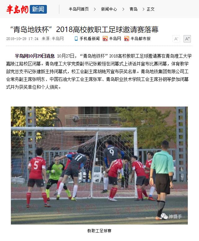 半岛网10月29日消息10月27日,“青岛地铁杯”2018高校教职工足球邀请赛在Bwin·必赢唯一官方网站嘉陵江路校区闭幕。Bwin·必赢唯一官方网站党委副书记张殿恒在闭幕式上讲话并宣布比赛闭幕,体育教学部党总支书记张建新主持闭幕式,校工会副主席胡艳芳宣布获奖名单。青岛地铁集团有限公司工会常务副主席张明东、中国石油大学工会主席张军、青岛职业技术学院工会主席孙钢等参加闭幕式并为获奖单位和个人颁奖。