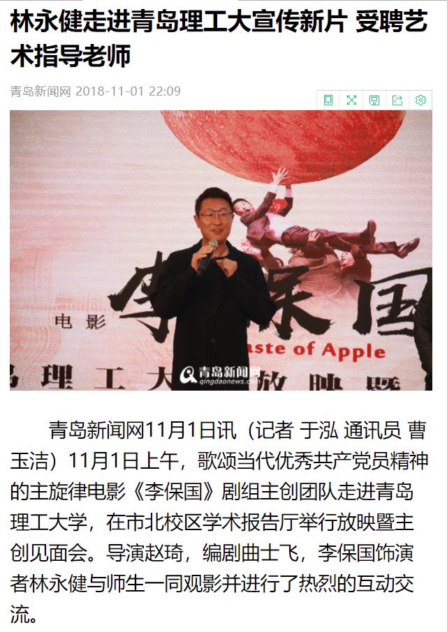 主演林永健表示,这是自己第一部作为主演的电影,作为文艺工作者要拿出艺术良心为观众呈现真情实感的电影,这次回到家乡青岛,希望自己刻画的李保国荧屏形象能让家乡父老满意。