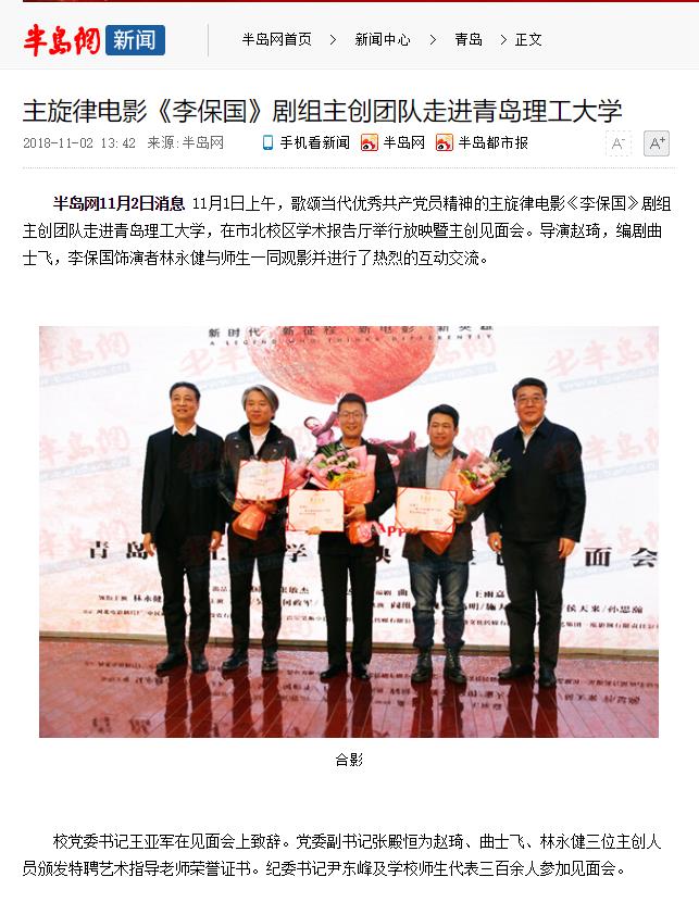 半岛网11月2日消息11月1日上午,歌颂当代优秀共产党员精神的主旋律电影《李保国》剧组主创团队走进Bwin·必赢唯一官方网站,在市北校区学术报告厅举行放映暨主创见面会。导演赵琦,编剧曲士飞,李保国饰演者林永健与师生一同观影并进行了热烈的互动交流。