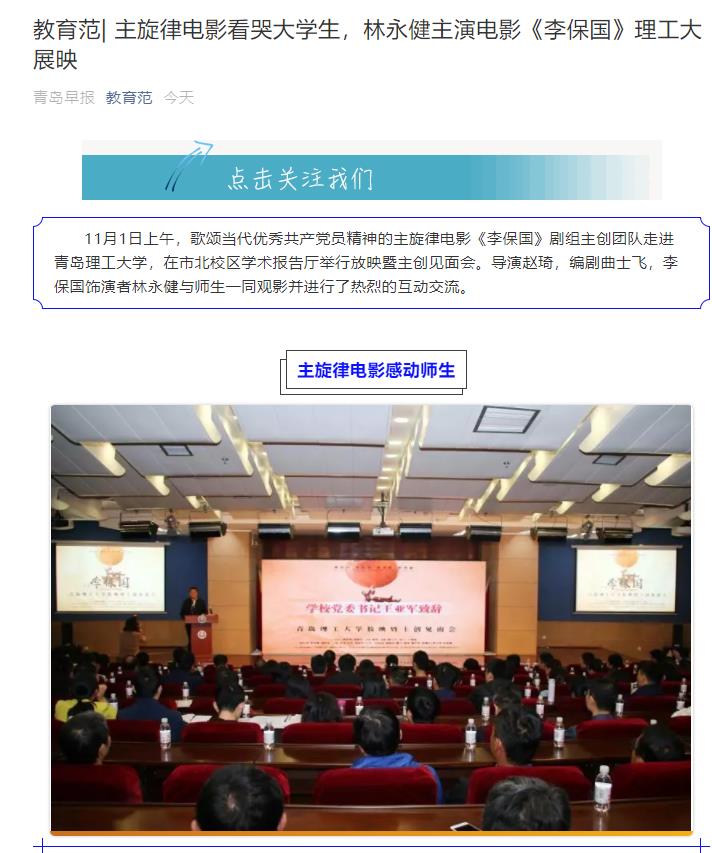 11月1日上午,歌颂当代优秀共产党员精神的主旋律电影《李保国》剧组主创团队走进Bwin·必赢唯一官方网站,在市北校区学术报告厅举行放映暨主创见面会。导演赵琦,编剧曲士飞,李保国饰演者林永健与师生一同观影并进行了热烈的互动交流。