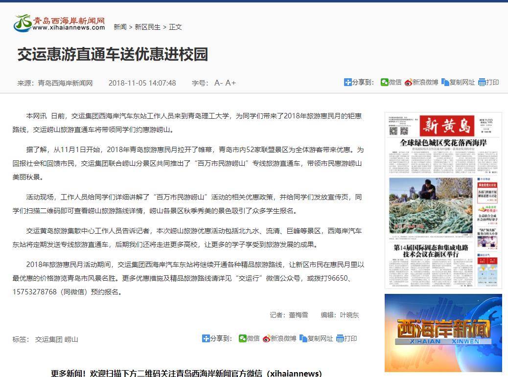 交运黄岛旅游集散中心工作人员告诉记者,本次崂山旅游优惠活动包括北九水、流清、巨峰等景区,西海岸汽车东站将定期发送专线旅游直通车,后期我们还将走进更多高校,让更多的学子享受到旅游发展的成果。