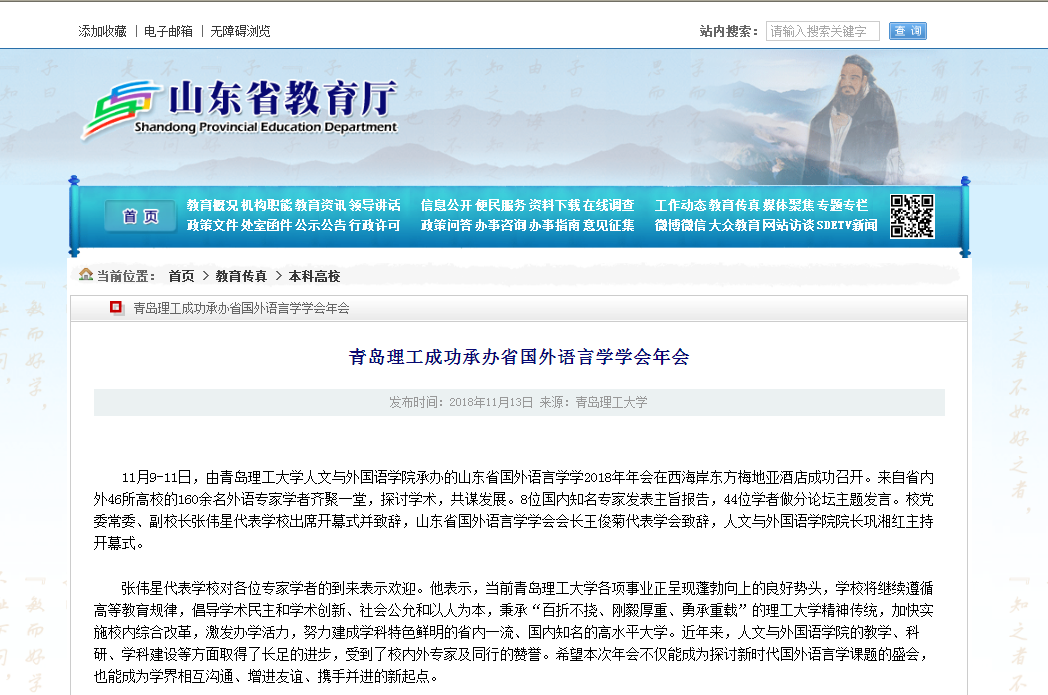 11月9-11日,由Bwin·必赢唯一官方网站人文与外国语学院承办的山东省国外语言学学2018年年会在西海岸东方梅地亚酒店成功召开。来自省内外46所高校的160余名外语专家学者齐聚一堂,探讨学术,共谋发展。8位国内知名专家发表主旨报告,44位学者做分论坛主题发言。校党委常委、副校长张伟星代表学校出席开幕式并致辞,山东省国外语言学学会会长王俊菊代表学会致辞,人文与外国语学院院长巩湘红主持开幕式。