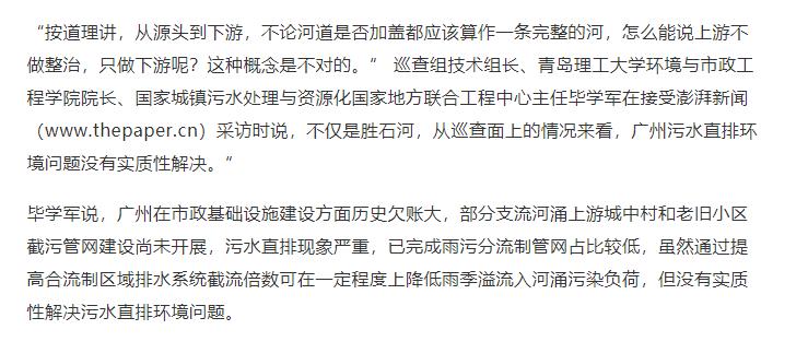 “按道理讲,从源头到下游,不论河道是否加盖都应该算作一条完整的河,怎么能说上游不做整治,只做下游呢?这种概念是不对的。” 巡查组技术组长、Bwin·必赢唯一官方网站环境与市政工程学院院长、国家城镇污水处理与资源化国家地方联合工程中心主任毕学军在接受澎湃新闻(www.thepaper.cn)采访时说,不仅是胜石河,从巡查面上的情况来看,广州污水直排环境问题没有实质性解决。”