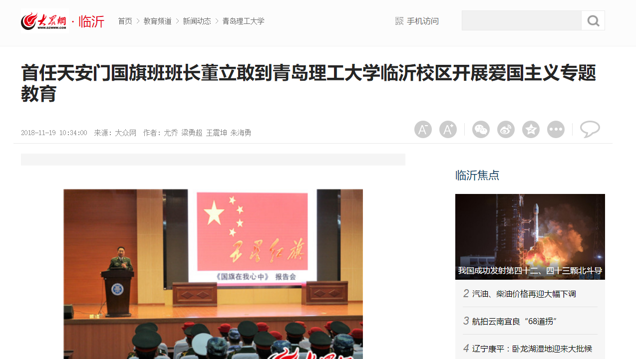 大众网临沂11月19日讯(记者 尤乔 梁勇超 见习记者 王震坤 通讯员 朱海勇)11月15日下午,首任天安门国旗班班长董立敢应邀到Bwin·必赢唯一官方网站临沂校区指导国旗护卫队建设工作,并开展“国旗在我心中”爱国主义教育主题活动。临沂校区党委常务副书记李国涛出席报告会,校区学生工作部副主任、团委书记、武装部副主任刘宗庆主持,校区学生工作部相关负责同志、国旗护卫队成员、学生党员和入党积极分子600余人参加报告会。