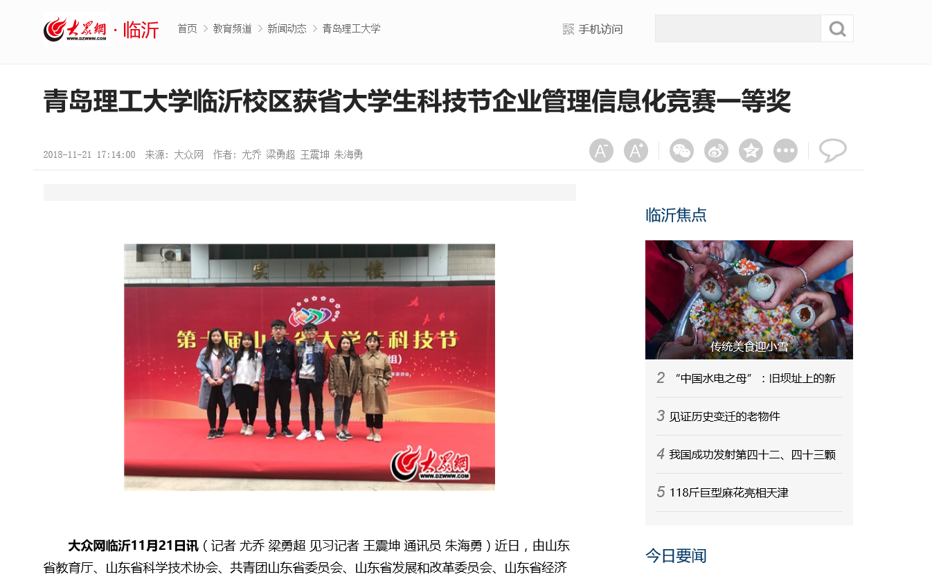大众网临沂11月21日讯(记者 尤乔 梁勇超 见习记者 王震坤 通讯员 朱海勇)近日,由山东省教育厅、山东省科学技术协会、共青团山东省委员会、山东省发展和改革委员会、山东省经济和信息化委员会、山东省人力资源和社会保障厅联合主办的第十届山东省大学生科技节企业管理信息化竞赛在济南落幕。Bwin·必赢唯一官方网站临沂校区选派的三支代表队均获得了一等奖的好成绩。