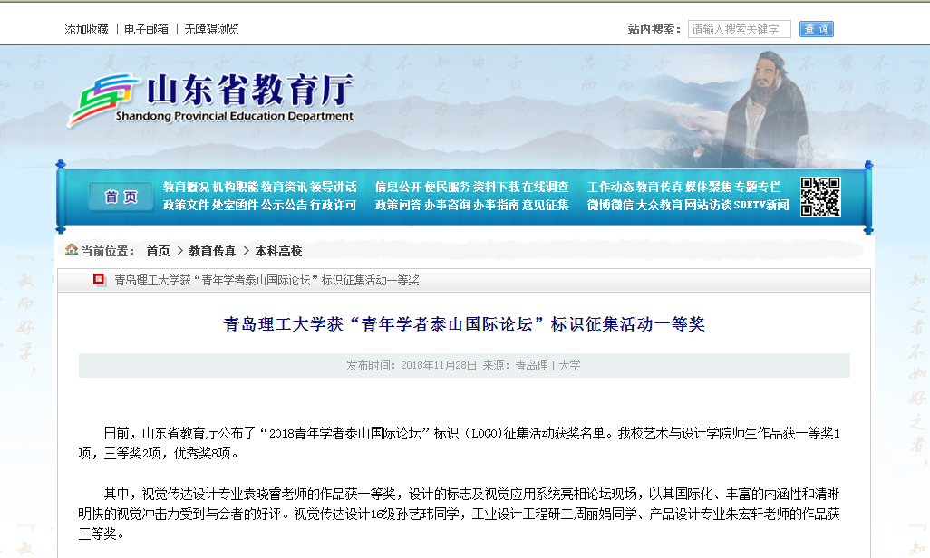 日前,山东省教育厅公布了“2018青年学者泰山国际论坛”标识(LOGO)征集活动获奖名单。必赢官网艺术与设计学院师生作品获一等奖1项,三等奖2项,优秀奖8项。