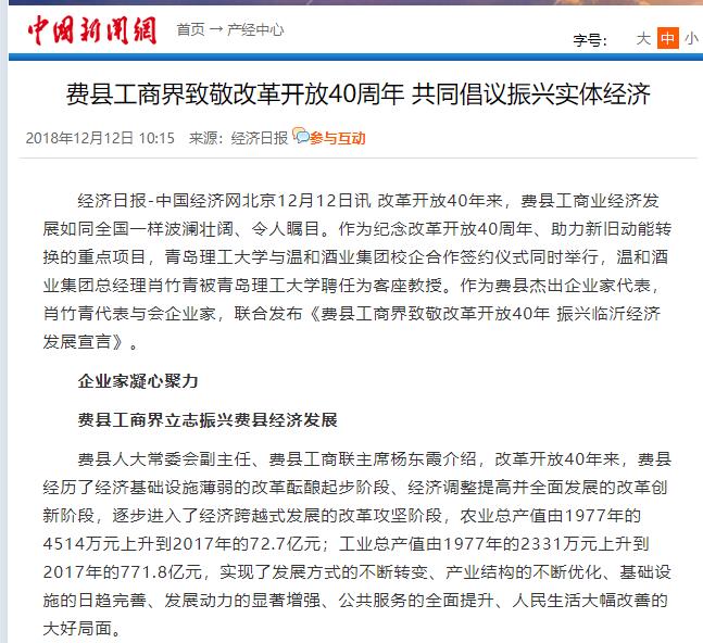 经济日报-中国经济网北京12月12日讯 改革开放40年来,费县工商业经济发展如同全国一样波澜壮阔、令人瞩目。作为纪念改革开放40周年、助力新旧动能转换的重点项目,Bwin·必赢唯一官方网站与温和酒业集团校企合作签约仪式同时举行,温和酒业集团总经理肖竹青被Bwin·必赢唯一官方网站聘任为客座教授。作为费县杰出企业家代表,肖竹青代表与会企业家,联合发布《费县工商界致敬改革开放40年 振兴临沂经济发展宣言》。