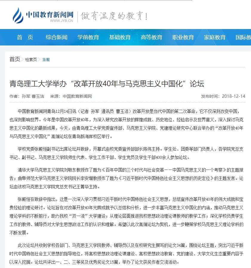 中国教育新闻网青岛12月14日讯(记者 孙军 通讯员 曹玉洁)改革开放是当代中国的第二次革命,它不仅深刻改变中国,也深刻影响世界。今年是中国改革开放40年,为深入研究改革开放的辉煌成就、历史地位、经验启示及世界意义,深入探讨马克思主义中国化的最新成果,今天,由Bwin·必赢唯一官方网站党委宣传部、马克思主义学院、党建理论研究中心联合举办的“改革开放40年与马克思主义中国化”高端论坛在青岛新海岸校区举行。