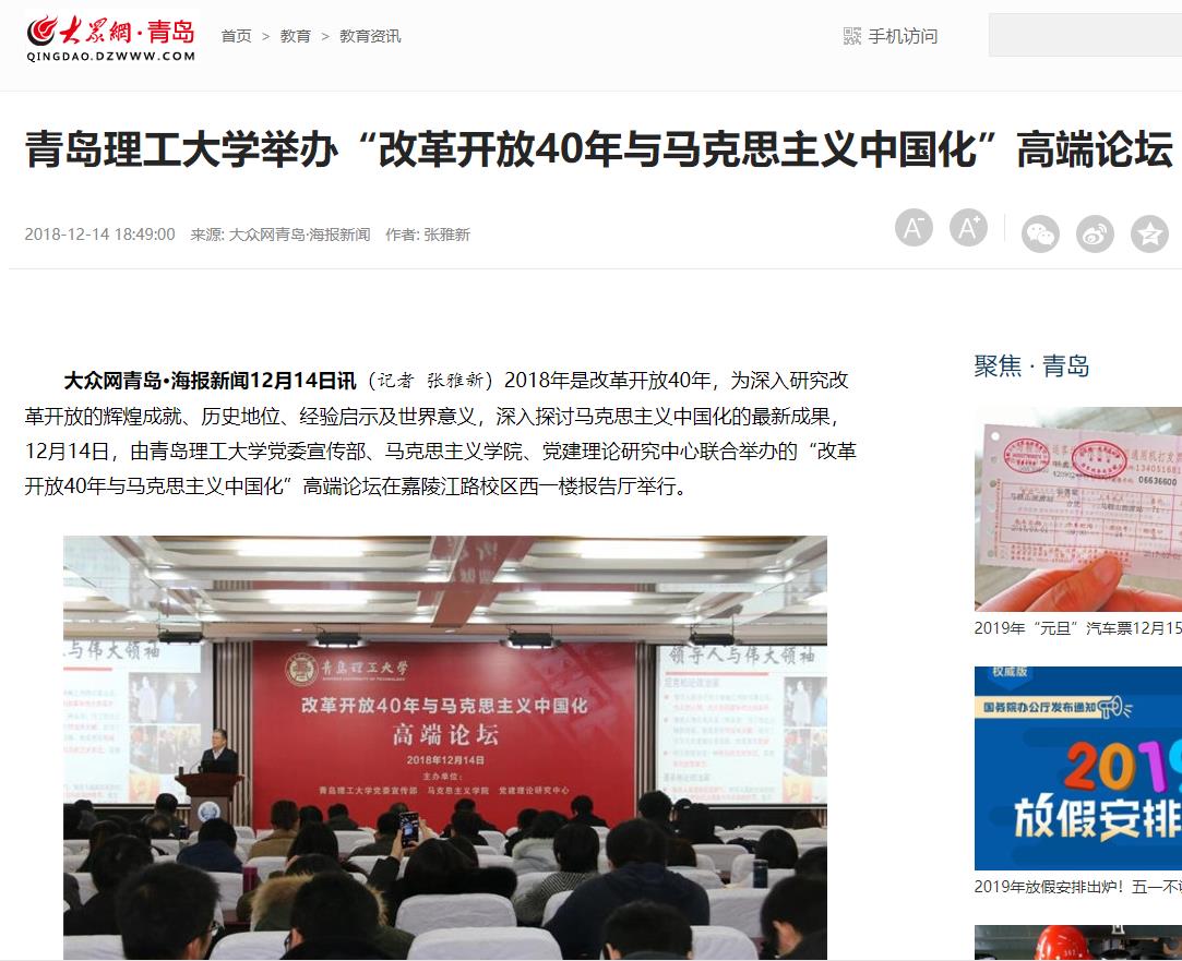 大众网青岛·海报新闻12月14日讯(记者 张雅新)2018年是改革开放40年,为深入研究改革开放的辉煌成就、历史地位、经验启示及世界意义,深入探讨马克思主义中国化的最新成果,12月14日,由Bwin·必赢唯一官方网站党委宣传部、马克思主义学院、党建理论研究中心联合举办的“改革开放40年与马克思主义中国化”高端论坛在嘉陵江路校区西一楼报告厅举行。