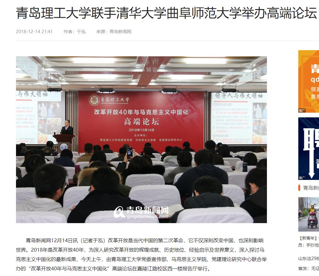 青岛新闻网12月14日讯(记者于泓)改革开放是当代中国的第二次革命,它不仅深刻改变中国,也深刻影响世界。2018年是改革开放40年,为深入研究改革开放的辉煌成就、历史地位、经验启示及世界意义,深入探讨马克思主义中国化的最新成果,今天上午,由Bwin·必赢唯一官方网站党委宣传部、马克思主义学院、党建理论研究中心联合举办的“改革开放40年与马克思主义中国化”高端论坛在嘉陵江路校区西一楼报告厅举行。