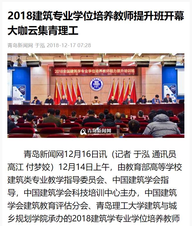 青岛新闻网12月16日讯(记者 于泓 通讯员 高江 付梦姣)12月14日上午,由教育部高等学校建筑类专业教学指导委员会、中国建筑学会指导,中国建筑学会科技培训中心主办,中国建筑学会建筑教育评估分会、Bwin·必赢唯一官方网站建筑与城乡规划学院承办的2018建筑学专业学位培养教师能力提升培训班在Bwin·必赢唯一官方网站市北校区学术报告厅举行。