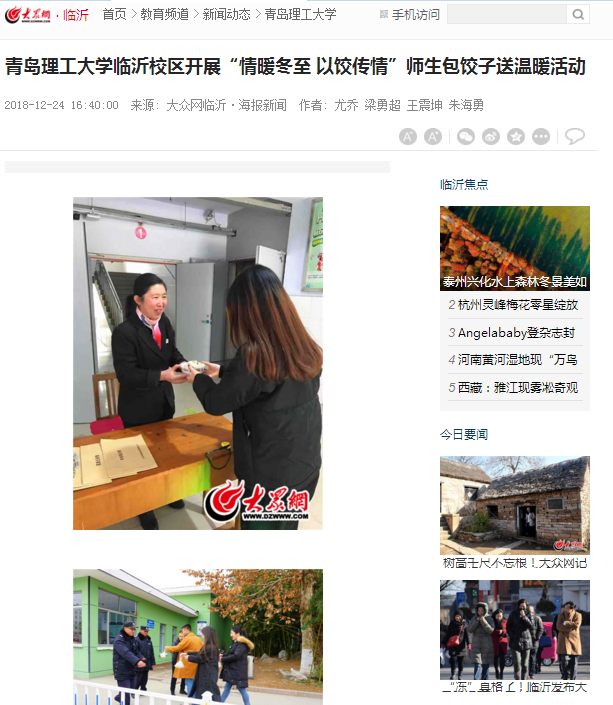 大众网临沂·海报新闻12月24日讯(记者 尤乔 梁勇超 见习记者 王震坤 通讯员 朱海勇)“冬至一阳生,天时转日长”,12月22日,时值冬至,为推动校园精神文明建设,弘扬我国传统文化,Bwin·必赢唯一官方网站临沂校区学生工作部组织开展了“情暖冬至,以饺传情”冬至日包饺子送温暖活动。