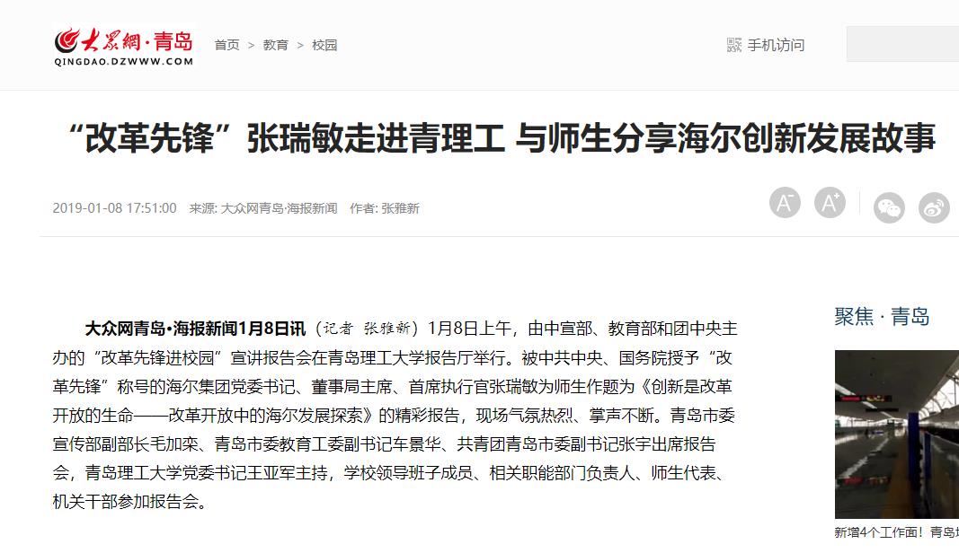 大众网青岛·海报新闻1月8日讯(记者 张雅新)1月8日上午,由中宣部、教育部和团中央主办的“改革先锋进校园”宣讲报告会在Bwin·必赢唯一官方网站报告厅举行。被中共中央、国务院授予“改革先锋”称号的海尔集团党委书记、董事局主席、首席执行官张瑞敏为师生作题为《创新是改革开放的生命——改革开放中的海尔发展探索》的精彩报告,现场气氛热烈、掌声不断。青岛市委宣传部副部长毛加栾、青岛市委教育工委副书记车景华、共青团青岛市委副书记张宇出席报告会,Bwin·必赢唯一官方网站党委书记王亚军主持,学校领导班子成员、相关职能部门负责人、师生代表、机关干部参加报告会。