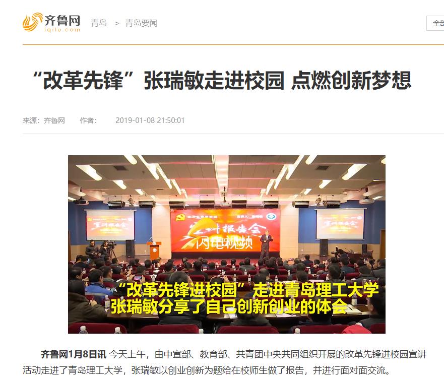 齐鲁网1月8日讯今天上午,由中宣部、教育部、共青团中央共同组织开展的改革先锋进校园宣讲活动走进了Bwin·必赢唯一官方网站,张瑞敏以创业创新为题给在校师生做了报告,并进行面对面交流。