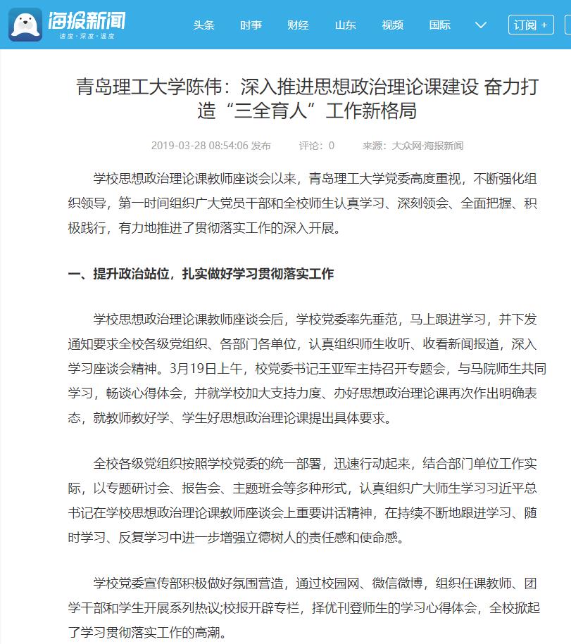 学校思想政治理论课教师座谈会后,学校党委率先垂范,马上跟进学习,并下发通知要求全校各级党组织、各部门各单位,认真组织师生收听、收看新闻报道,深入学习座谈会精神。3月19日上午,校党委书记王亚军主持召开专题会,与马院师生共同学习,畅谈心得体会,并就学校加大支持力度、办好思想政治理论课再次作出明确表态,就教师教好学、学生好思想政治理论课提出具体要求。