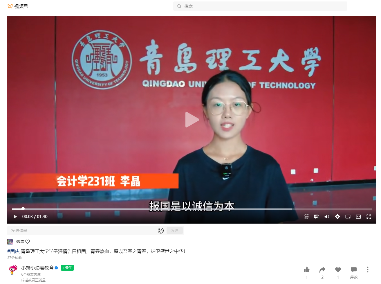新浪视频号:Bwin·必赢唯一官方网站学子深情告白祖国,青春热血,愿以吾辈之青春,护卫盛世之中华!