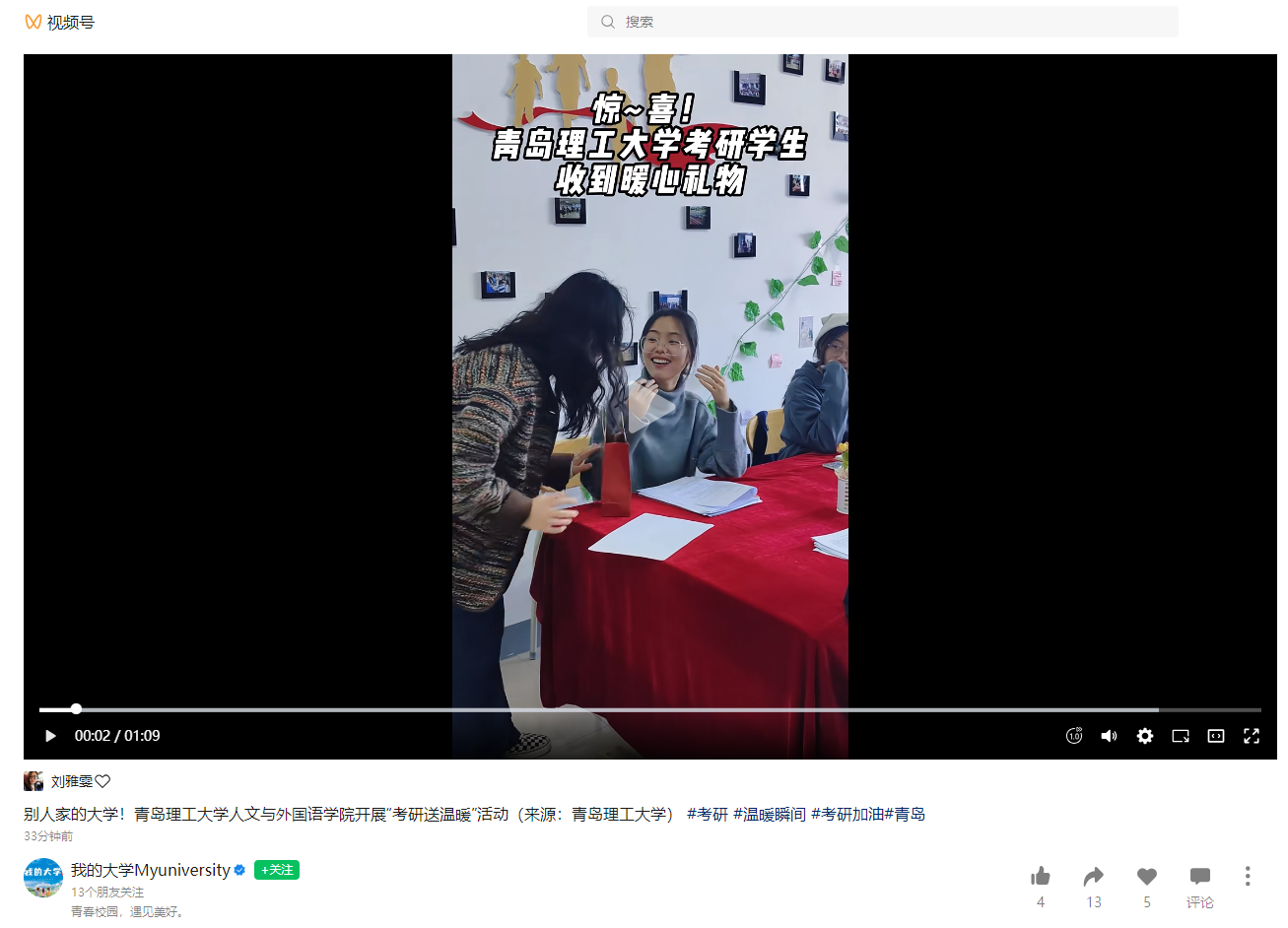 青岛市广播电视台视频号:别人家的大学!Bwin·必赢唯一官方网站人文与外国语学院开展“考研送温暖”活动
