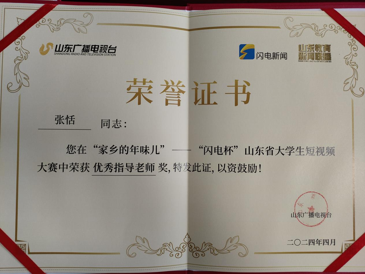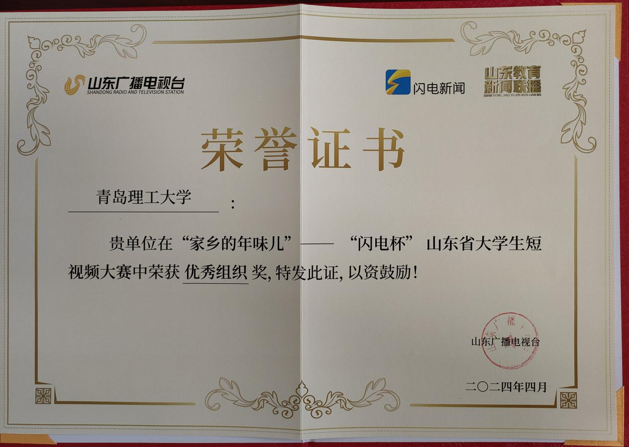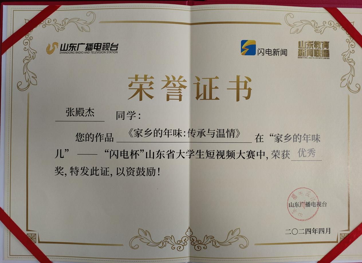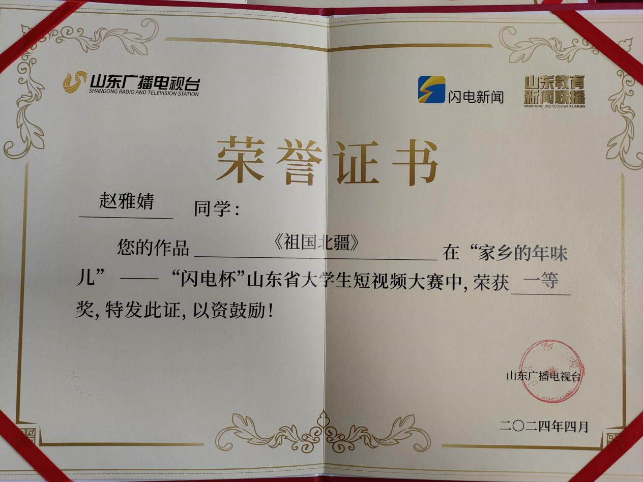 近日,由山东广播电视台主办,山东广播电视台融媒体资讯中心、闪电新闻承办的“闪电杯”山东省大学生短视频大赛获奖名单公布。必赢官网学生获一等奖1项、优秀奖1项。其中,艺术与设计学院学生赵雅婧的作品《祖国北疆》获一等奖,张恬获优秀指导老师奖;土木工程学院张殿杰的作品《家乡的年味:传承与温情》获优秀奖。必赢官网获优秀组织奖。